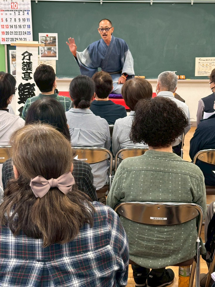 西毛支部では、10月19日、額部(ぬかべ)地域づくりセンターで件名をテーマに、落語&座談会を開催しました。当日は介護亭楽珍氏、富岡市社会福祉協議会茂木係長ご協力のもと、富岡市額部地区、高瀬地区民生委員・児童委員の方々にご参加いただきました。